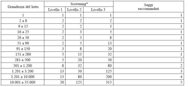 2.7 Il numero di oggetti selezionati per il campionamento e la quantità di campioni tratti da più di un oggetto da collazionare prima di effettuare il saggio, dipende dai casi. In alcuni casi, per esempio, può essere più appropriato selezionare a caso uno o più oggetti da un lotto e saggiarli separatamente, in altri casi può essere preferibile trarre campioni da un maggior numero di oggetti, riunendoli successivamente e saggiandoli insieme. L'esperienza circa la variazione di titolo all'interno di un lotto e il grado di danneggiamento di un oggetto a seguito del campionamento devono essere i fattori decisivi. In via generale, vi è un numero raccomandato di oggetti da selezionare in considerazione della grandezza del lotto e del livello di screening. La seguente tabella indica il numero raccomandato di oggetti da selezionare a seconda della grandezza del lotto: